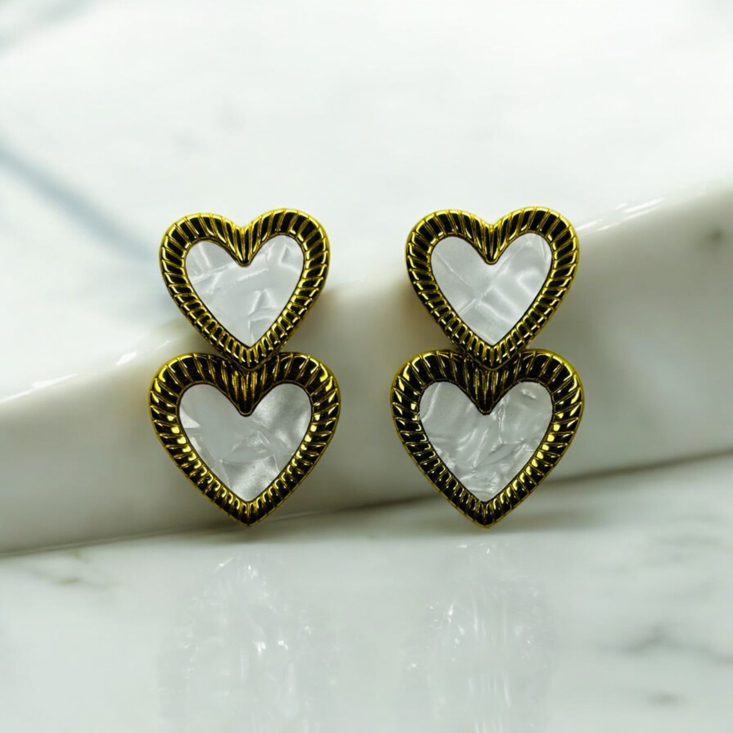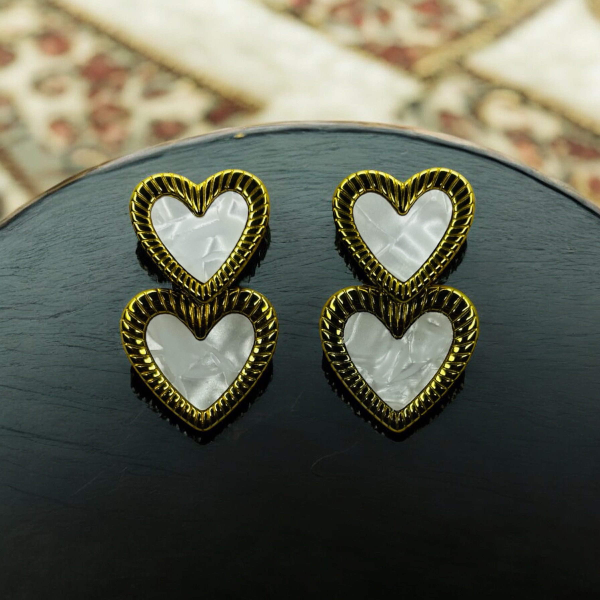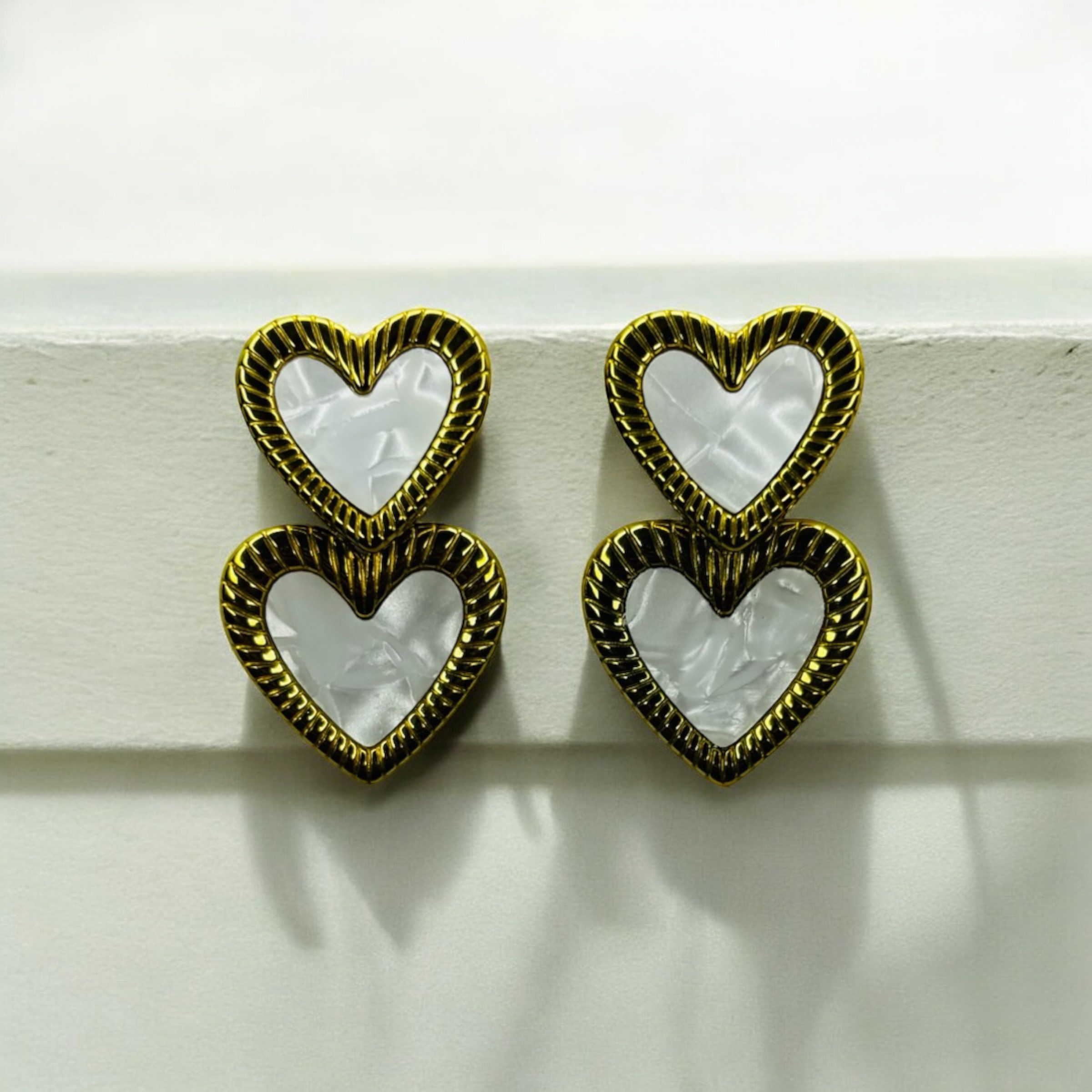 The Heartloop Earrings feature a cascading duo of sculpted hearts, outlined in antique gold with a rich, textured edge that adds vintage flair. Nestled inside is a glossy, mother-of-pearl finish that catches the light with every tilt of your head.