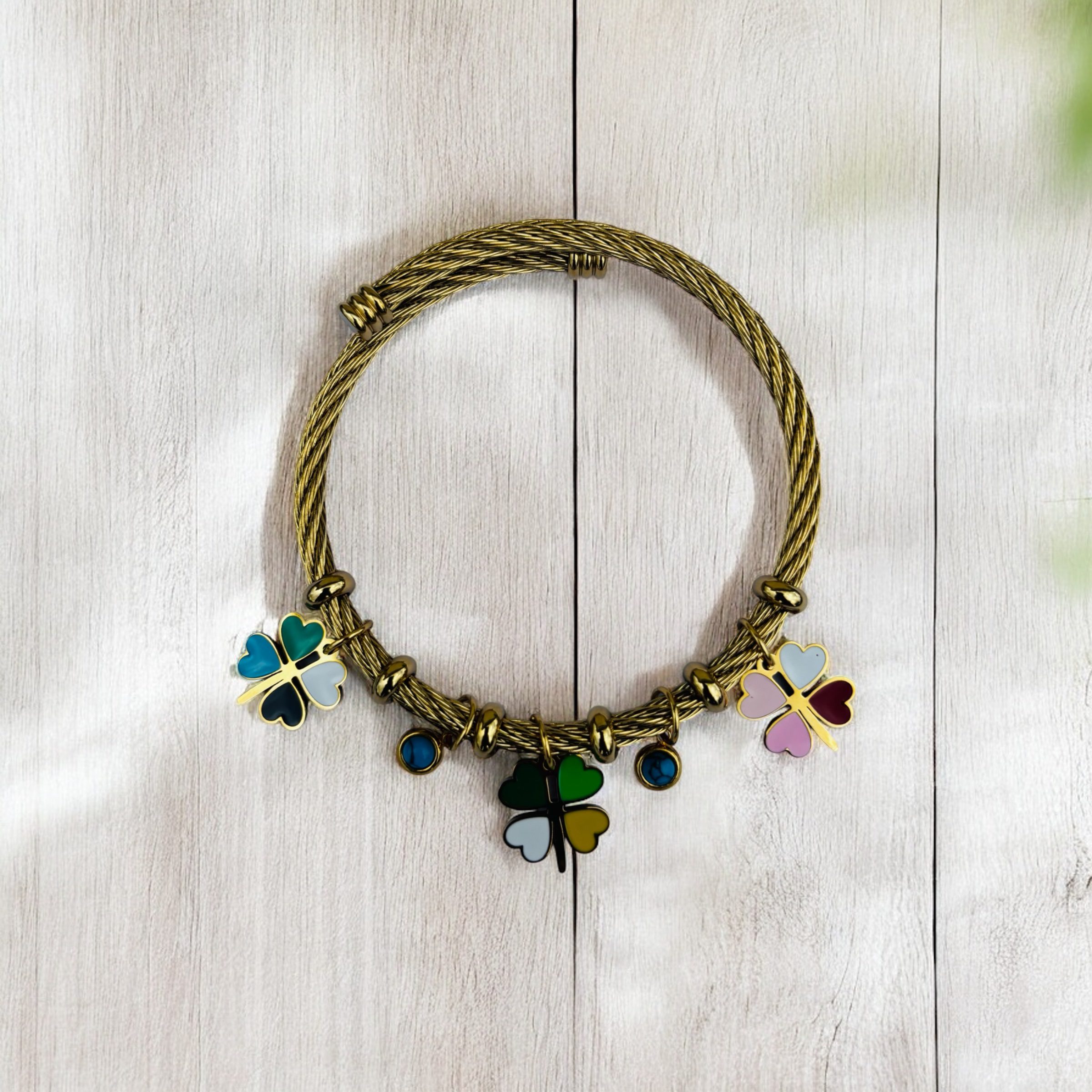 - Twisted gold cable design with clovers